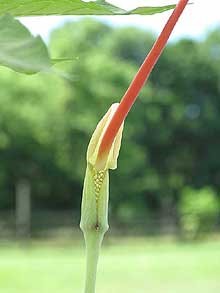 The Green Dragon is a perennial wildflower which grows 15 to 90 cm tall. It is mostly found in wet forests along streams, and forests inhabited with Maple trees. Its leaves are slender and arranged in a semicircle at the top of the plant, it has a dense cluster of bright red berries, with light yellow seeds in each berry. It has one long protruding stem that will flower in May and June (from which the berries will grow in late summer).