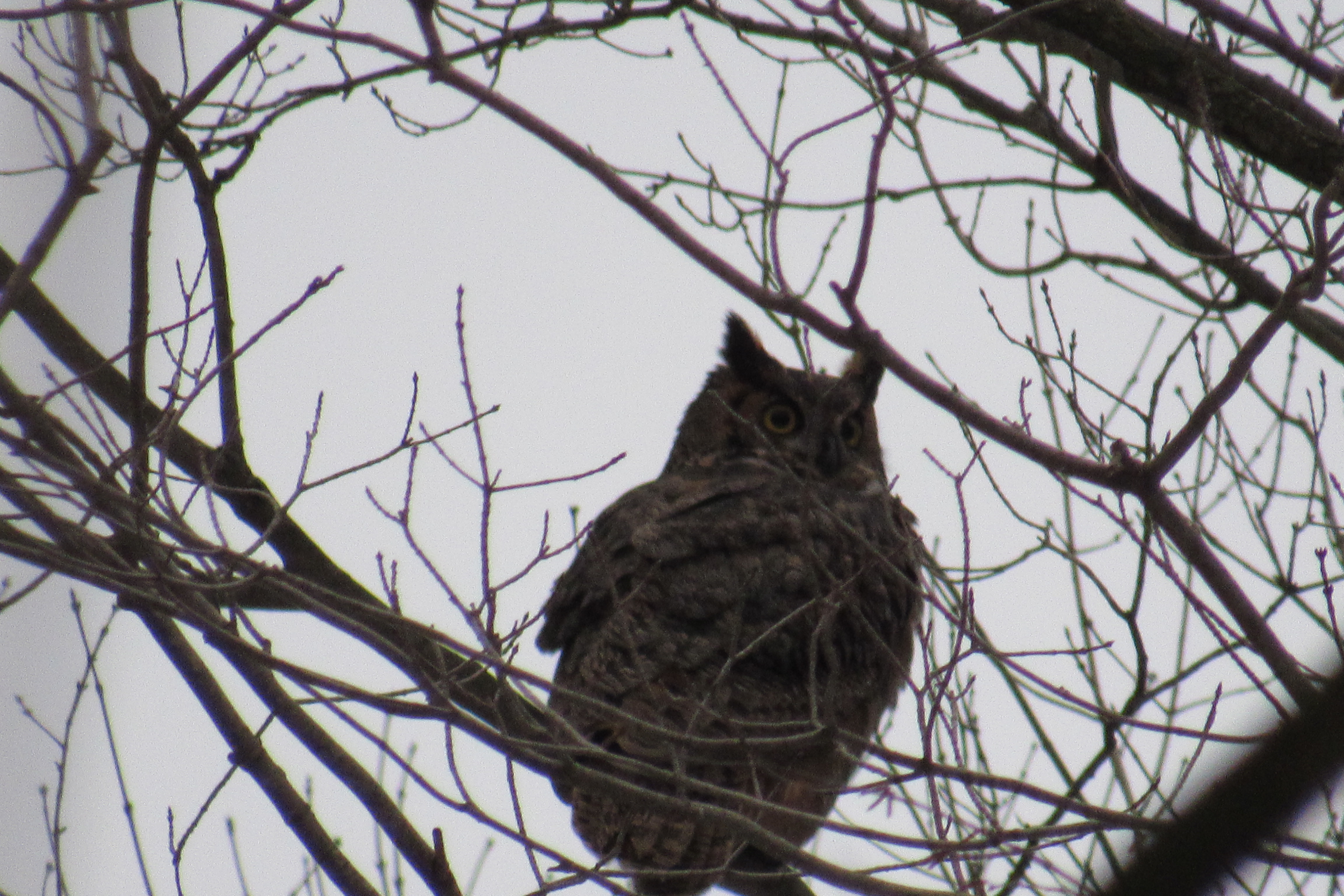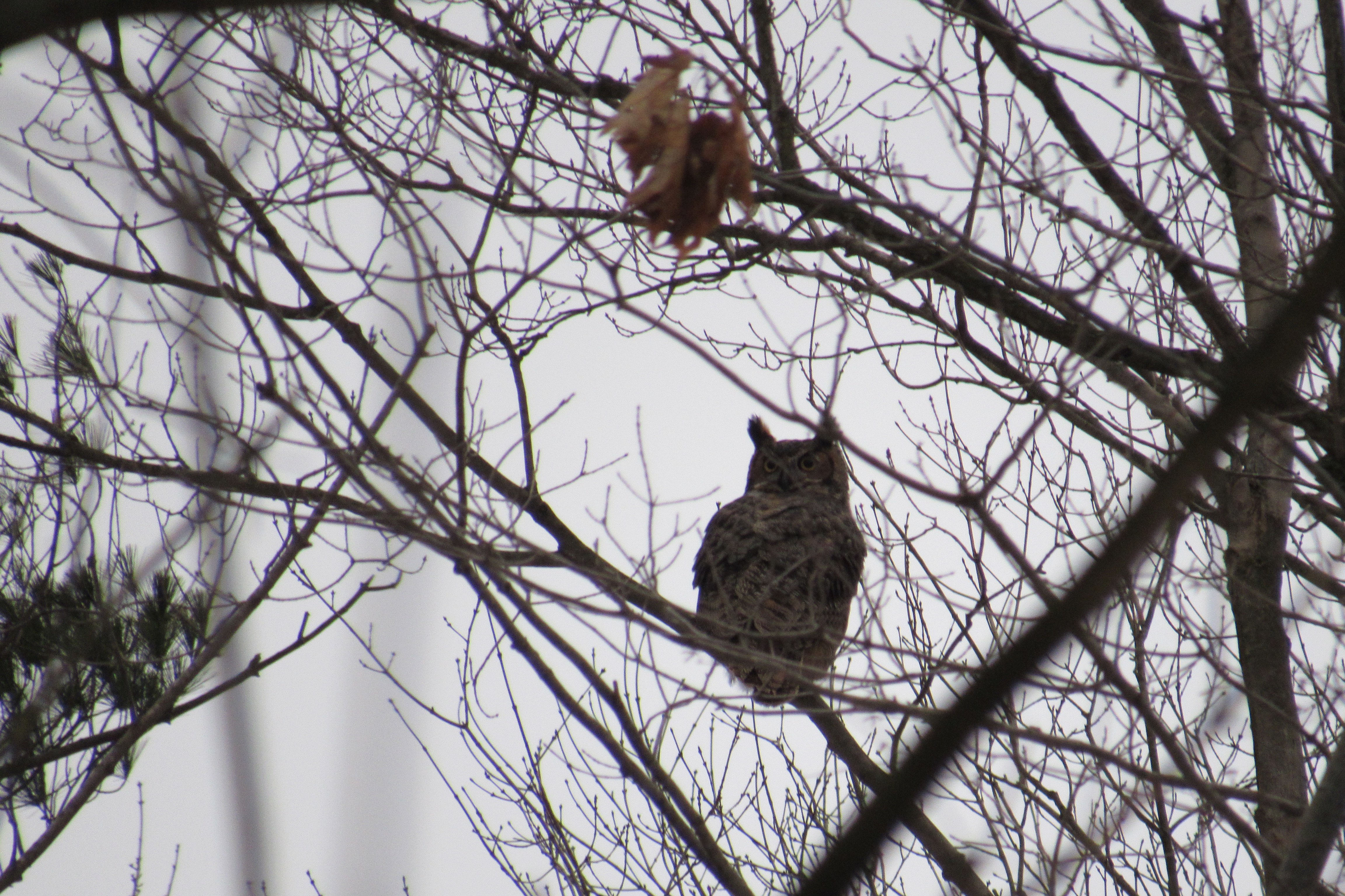 Thanks to Megan Leedham for sending these photos from our December 2020 bird count. With its long, earlike tufts, intimidating yellow-eyed stare, and deep hooting voice, the Great Horned Owl is the quintessential owl of storybooks. It is one of the most common owls in North America, equally at home across all landscapes – wetlands, forests, grasslands, backyards, cities and almost any other semi-open habitat between the Arctic and the tropics. The great horned owl remains so widely distributed and remarkably tolerant of major habitat disturbance by people that its future seems secure. It is listed as “Least Concern (Population stable). However, it is always exciting when we see a bird of prey of this stature on our property.
