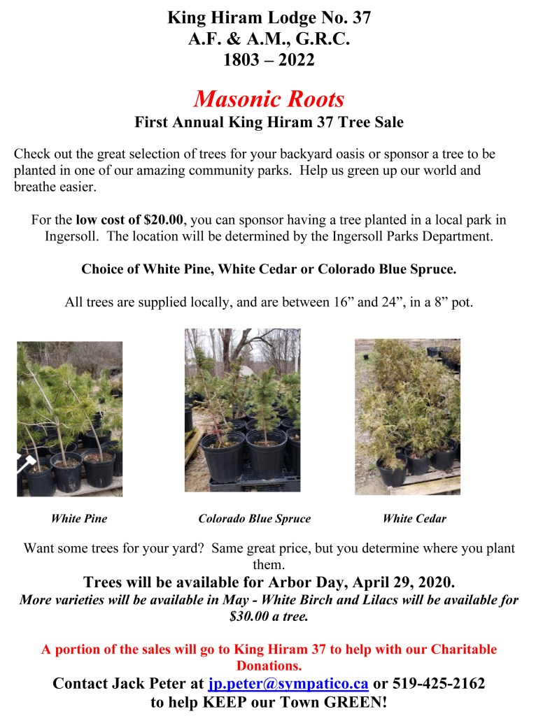 The King Hiram Lodge No. 37 is hosting the first annual King Hiram 37 Tree Sale.