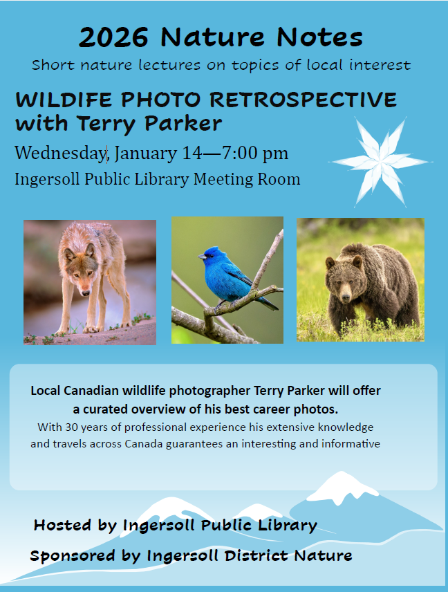 Local Canadian wildlife photographer Terry Parker will offer a curated overview of his best career photos. With 30 years of professional experience his extensive knowledge and travels across Canada guarantees an interesting and informative showcase of our country’s natural diversity. Contact Sheila, 519-485-2645.