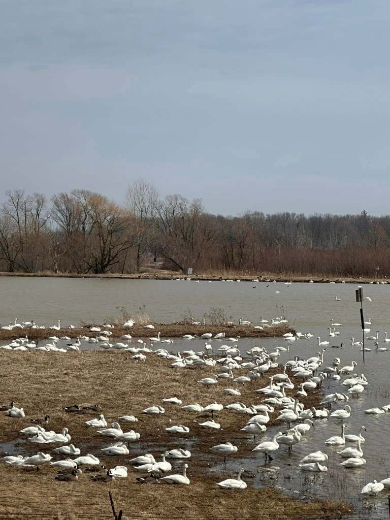 Spring’s a comin’! Ingersoll District Nature Club members enjoyed pancakes and maple syrup and a walk through Springwater Conservation Area. Spotted a pileated woodpecker, a bald eagle, red bellied woodpeckers mating and a pair of hooded mergansers. Then off to Aylmer Wildlife Management for migrating tundra swans and Canada geese. Started the morning in the rain and ended in sunshine… great outing!