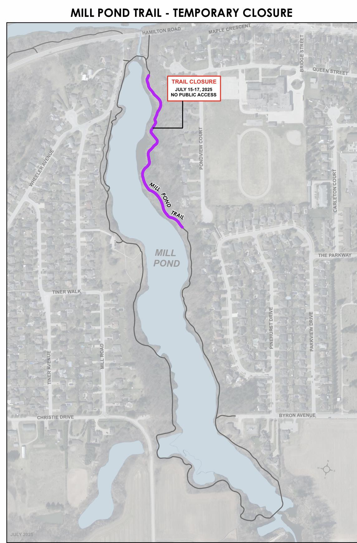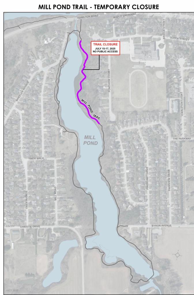 Starting Tuesday, July 15, 2025, this section of Mill Pond trail is scheduled to be CLOSED while Upper Thames will be completing some crib wall repairs.